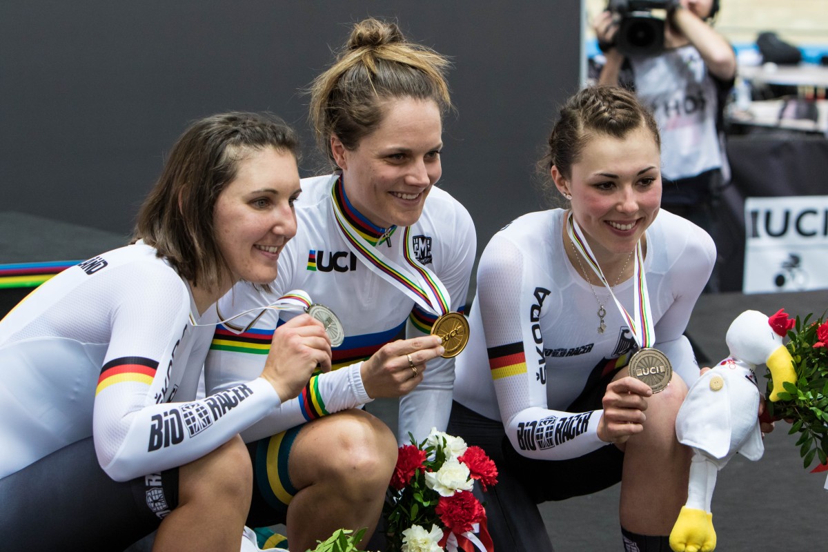 Resultat der WM: Dreimal Bronze im Keirin (Stefan Bötticher), Teamsprint (Miriam Welte und Emma Hinze), in der Einerverfolgung (Lisa Klein) und zweimal Silber jeweils in der Einerverfolgung bei den Frauen (Lisa Brennauer) und Gold bei den Männern (Domenic Weinstein).