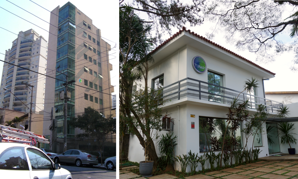 Bild links: Erstes TUNAP-Büro (vierter Stock); Bild rechts: Heutiges Bürogebäude.