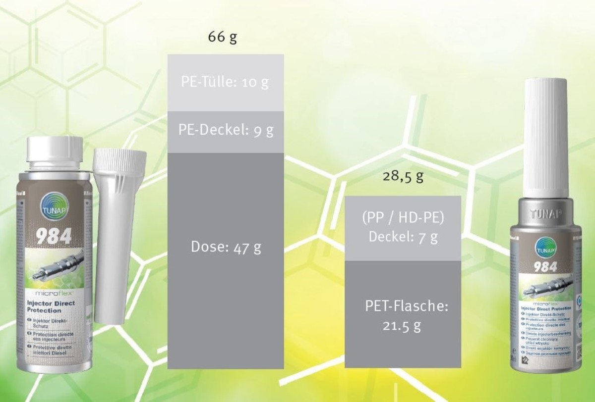Neben den ökologischen Produktvorteilen, die im Wirkstoff verankert sind, trägt die Verpackung ebenfalls zu einer Reduktion von Emissionen im Vergleich zur marktüblichen Verpackungslösung (Weißblechdose) bei. Betrachtet man den Lebenszyklus der Kunststoff-Flasche im Vergleich zur Weißblechdose, so wird hier der Kohlenstoff-Fußabdruck um insgesamt 188 t CO₂reduziert. Vor allem im Herstellungsprozess von Weißblech wird viel Energie verbraucht – in dieser Phase weist die Kunststoff-Flasche einen weitaus niedrigeren Product Carbon Footprint auf.