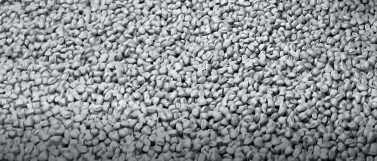 Das Granulat aus recycelten Kunststoffen ist grau und bildet die Basis für das Spritzgussverfahren, das den Werkstoff in die gewünschte Form bringt.